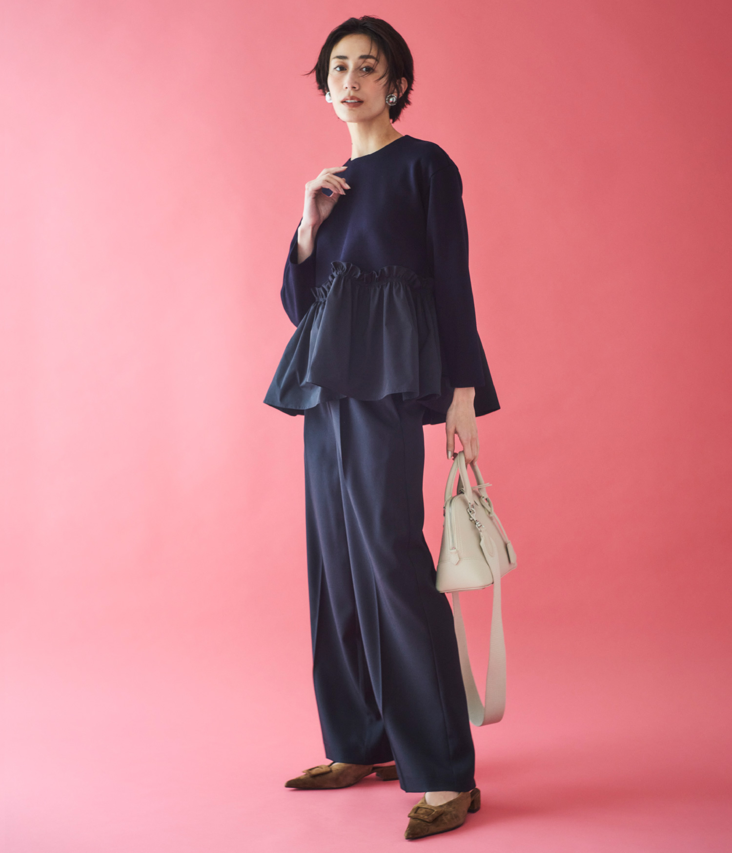 ブラウスのペプラム部分にハリのあるメモリー生地が使われた、華やかなパンツセットアップ。パンツは落ち感のあるワイドデザインになっているので、卒入学式などのオケージョンに最適。モードなペプラム以外はすっきりと仕上げているので、横からの見た目もシャープ。