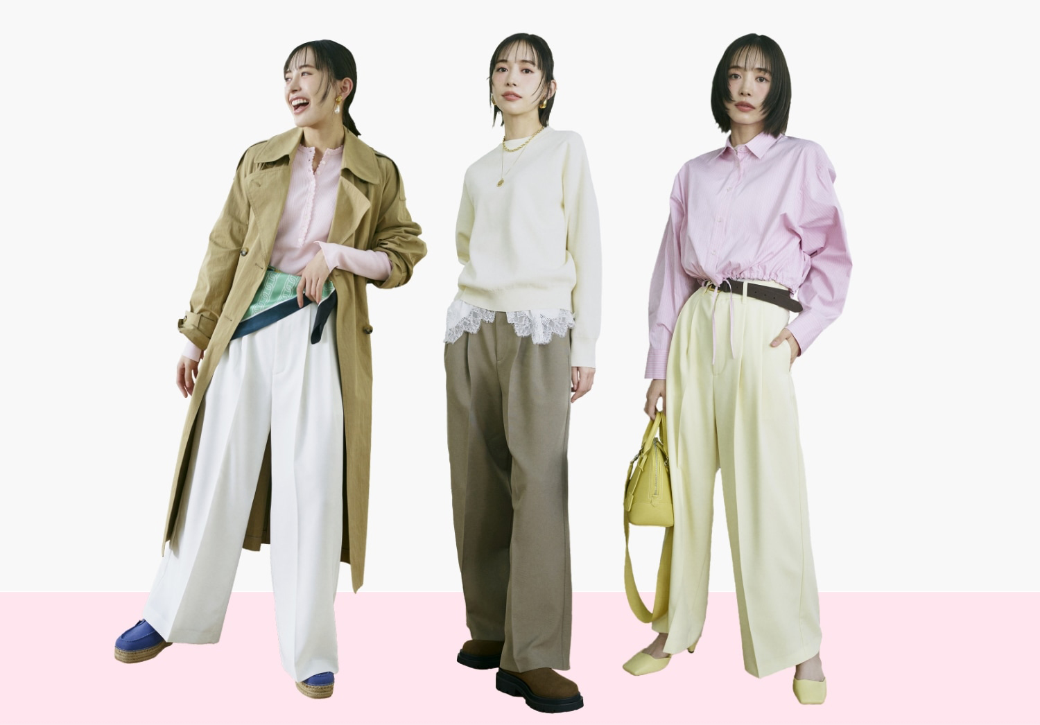 ワイドパンツは、足元を少し意識するだけで印象が変わります。スニーカーで思いきりカジュアルに振るのも可愛いですが、ローファーやミュールを合わせることで、ぐっと洗練された雰囲気に。ベルトやバッグをプラスするなど、ほんの小さな工夫で、より自分らしくおしゃれを楽しめますよ。