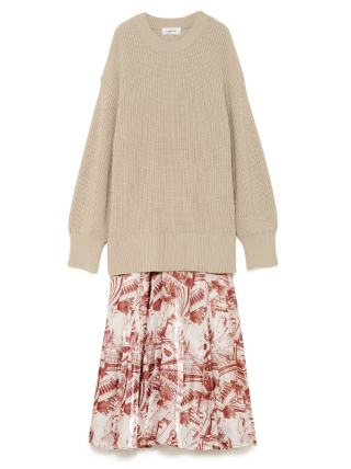 セットアップというと同じ素材と思いがちですが、違う素材のセットアップを合わせた時、 最高のシルエットになるよう計算されているので、とっても綺麗。 ニットと光沢のあるスカートはそれぞれ素朴なのにとってもエレガント。 休日の旦那さんとのラフなお休みに、さらりと着てお出かけしたい一着。