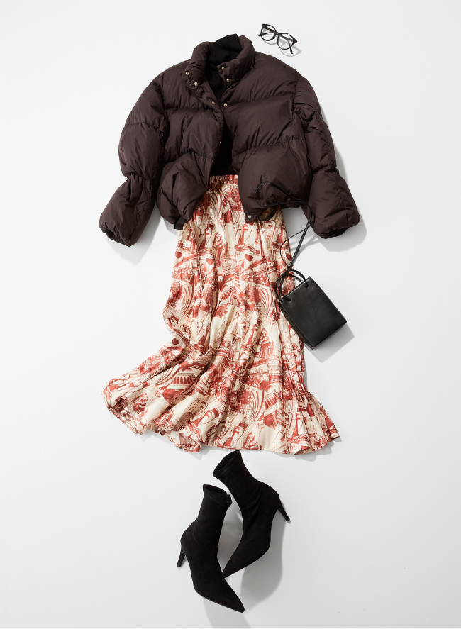 冬のアウトレットはかなり寒い。 車でいくので楽チンな格好はしたいけれど、スエットは嫌だから、こんな女らしいスカートにダウンがぴったり。 スカートはウエストゴムで、シワになりにくいので、歩きやすくて、 インにタイツを仕込めば、きちんと感と防寒を兼ね備えたスタイルに。
