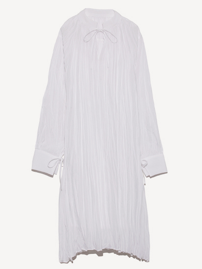 Vネックと立ち上がった襟のデザインが、女性らしい華奢な首元を演出。 シワ加工してある素材だから、小さくまとめて旅行にも持っていける。 広がった袖は、紐で調整できるので、シーンによって使いこなせます。 パーフェクトなインナーがついているから、アイロンいらず。 旅先では、インナーを使わずに水着の上に羽織るのも◎です。
