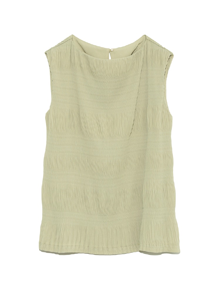 ランダムでふんわりとしたプリーツ使いが新鮮! トップスもスカートも、身体のラインを細く見せてくれるのに、肉感を拾うことはありません。 やや長めのトップスは、裾をアウトにして着てもOK。同素材のスカートは、裾に近い部分の切り替えが少し長めに取られているのがポイント。歩いたり、風をはらんだときに揺れる感じが、ドラマティックです。 上下セットで揃えておくと、重宝すること間違いナシ!