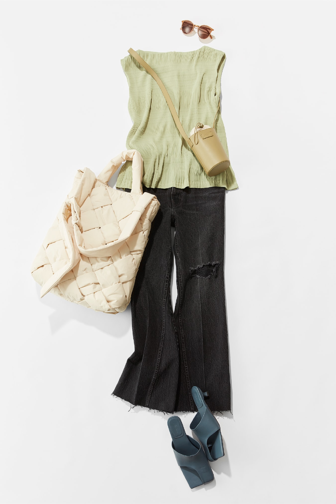 裾をアウトにして着たいときは、ボリュームのあるボトムスを合わせるのもおすすめ。 例えば、ワイド&フレアシルエットのブラックデニム。そこに、ビッグバッグと水筒やペットボトルを入れられる筒形のショルダーバッグ。足元はスクエアトゥのトングサンダル。全てが少しずつ個性的ですが、色味が全てオーガニックなので、チグハグになりません。 海外の女の子が真夏に着ているイメージのスタイリングです。
