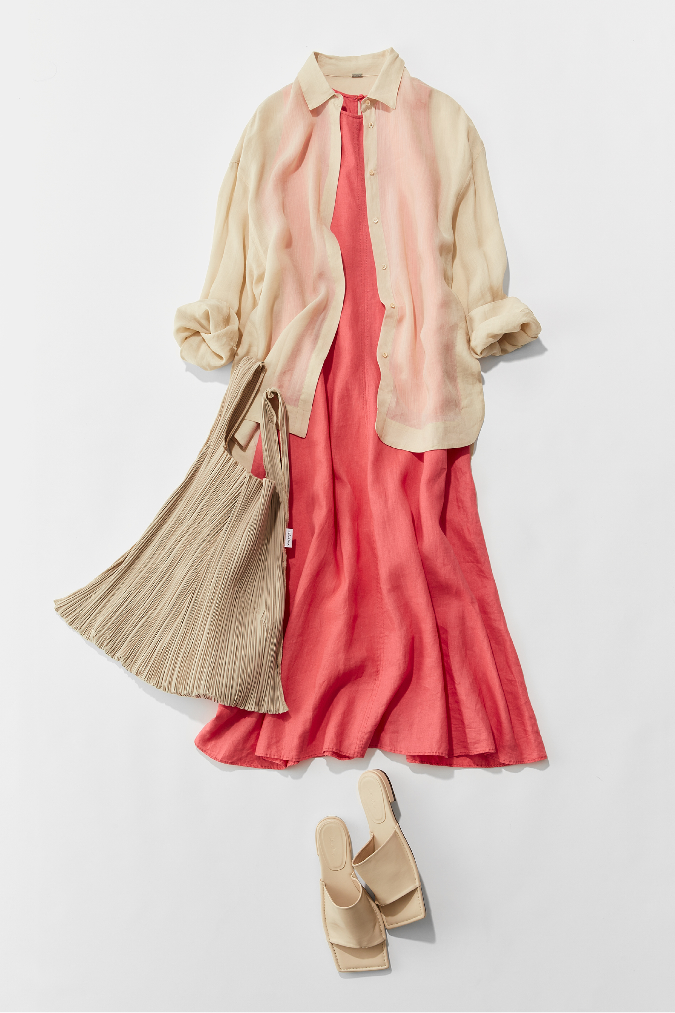 コーラルピンクのような、少しイエロー味のあるピンクは、日本人の肌に馴染みやすい色。日焼け肌さんとも色白さんとも相性が良く、着ると間違いなく気分が上がります♡ そのまま一枚で着るだけでキマるので、あとは小物をシーンに合わせてコーディネートして。 写真ではあまり見えていませんが、今回は籐のビッグクラッチを。大きな台形が身体の中心にくることで、カッコよさが加わります。