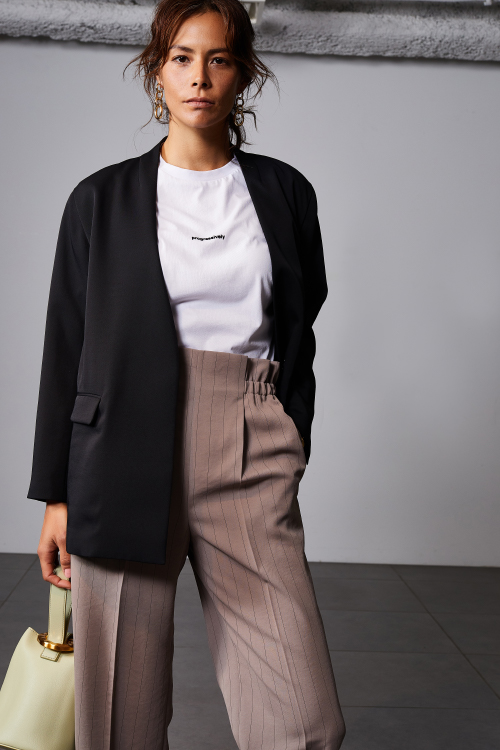 ボックスシルエットのスタイリッシュなノーカラージャケット。